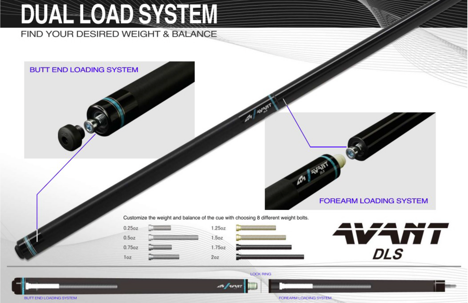 The revolutionary AVANT with its Dual Loading System offers unparalleled customizability allowing the AVANT cue to be balanced and weight adjusted at the same time. Optimum weight and balance can be achieved through 8 different bolts which can be inserted in butt end and forearm to adapt the weight and balance in 0.25oz increments.